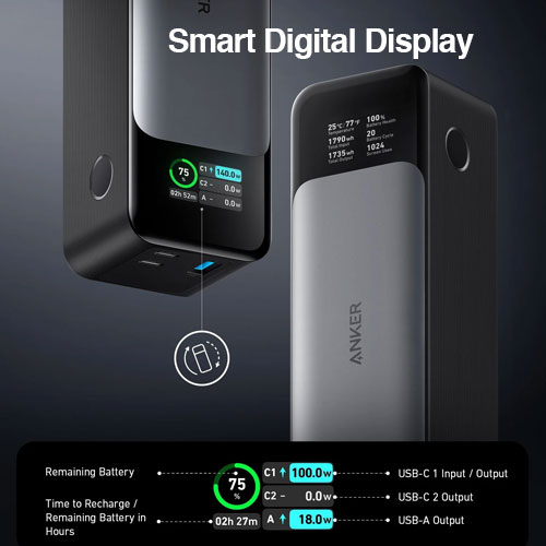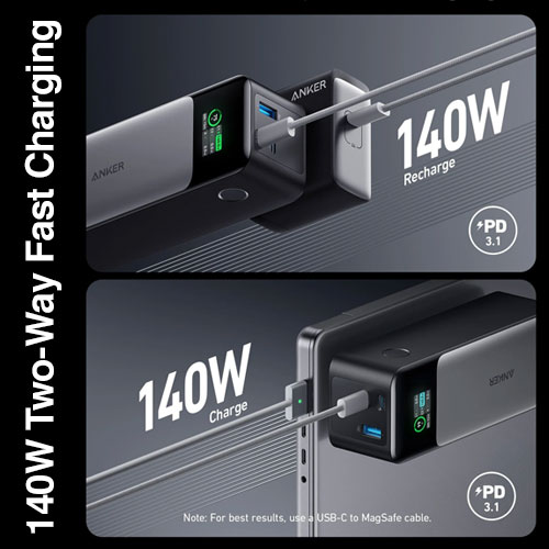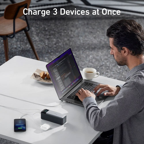 Recargue rápidamente hasta tres dispositivos al mismo tiempo con el banco de energía 737 USB-C de 24,000 mAh de Anker. Compatible con PD 3.1 y hasta 140 W en un solo puerto USB-C, este banco de energía proporciona suficiente energía para dispositivos exigentes de carga rápida, como computadoras portátiles. El 737 ofrece dos puertos USB-C y un solo puerto USB-A, para que pueda cargar una computadora portátil, un teléfono y una tableta al mismo tiempo. Con hasta 140 W durante una recarga (se requiere un adaptador de corriente USB-C), nunca estará mucho tiempo sin la comodidad de carga portátil del Anker 737.